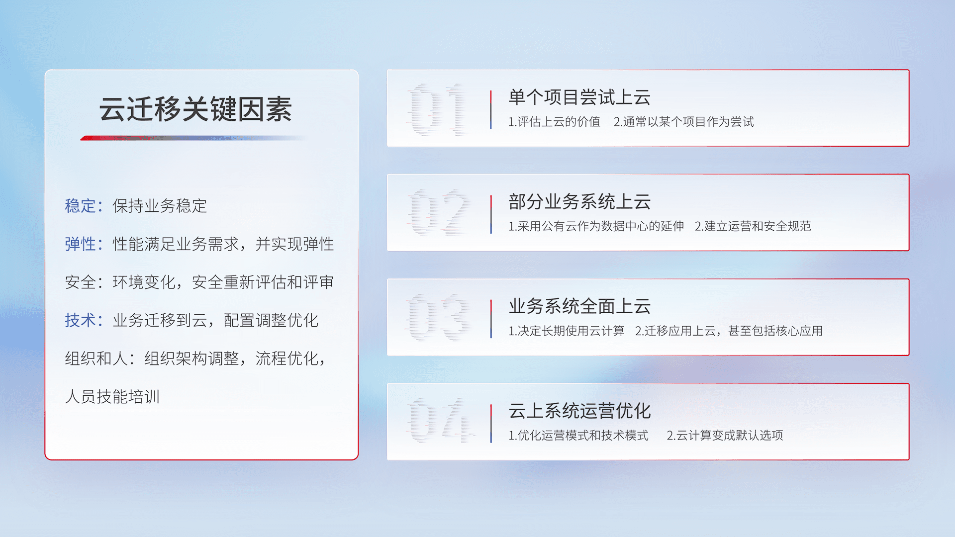 结合实际业务,,,从规划设计、、、云平台选型、、、云原生改造、、、数据迁移、、、、集成交付,,迁移全过程为客户识别最佳上云路径,,做好风险识别管理,,,,设计网络架构、、、、身份权限、、、、安全审计合规、、、操作审计、、、日志审计、、、、监控告警策略、、多站点容灾设计等,,,对云上基础设施进行整体规划,,提升IT治理水平,,,以满足弹性、、、高可用、、、高性能的需求。。。。